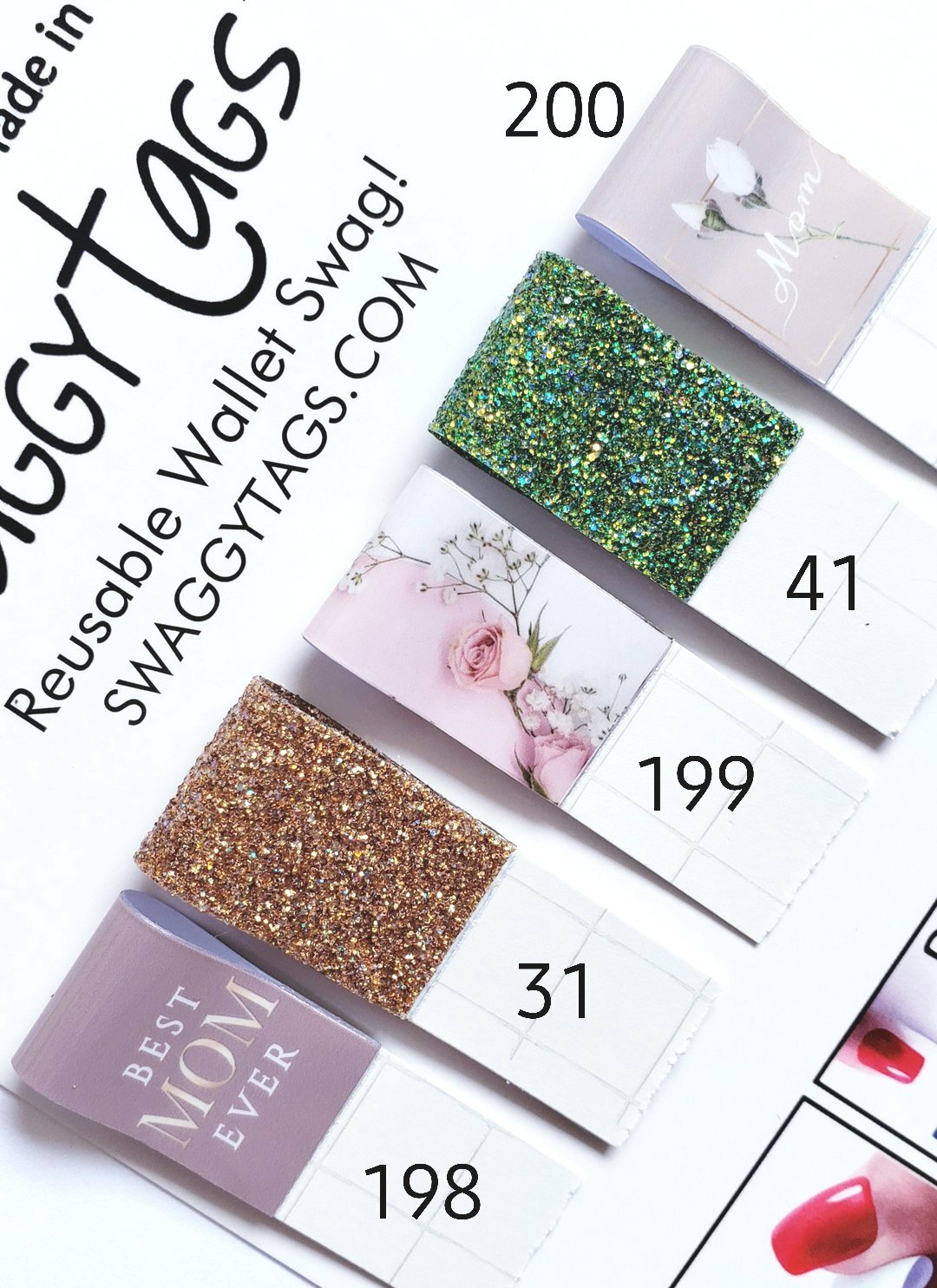 Swaggy Tags are Reusable Tags for pulling out credit cards, debit cards, ID, and store cards from your wallet with no hassles! Perfect for short nails, arthritis OR long nails! No more struggling at the gas pump and many ATMs. Even pick up dropped cards and coins on flat surfaces!