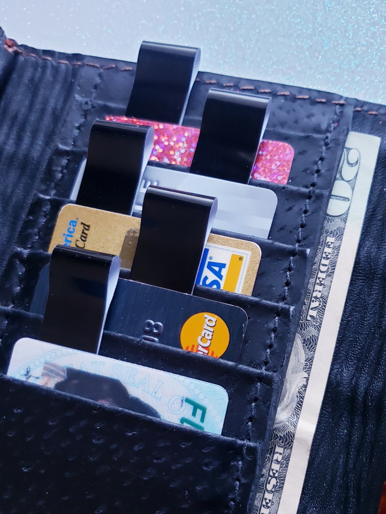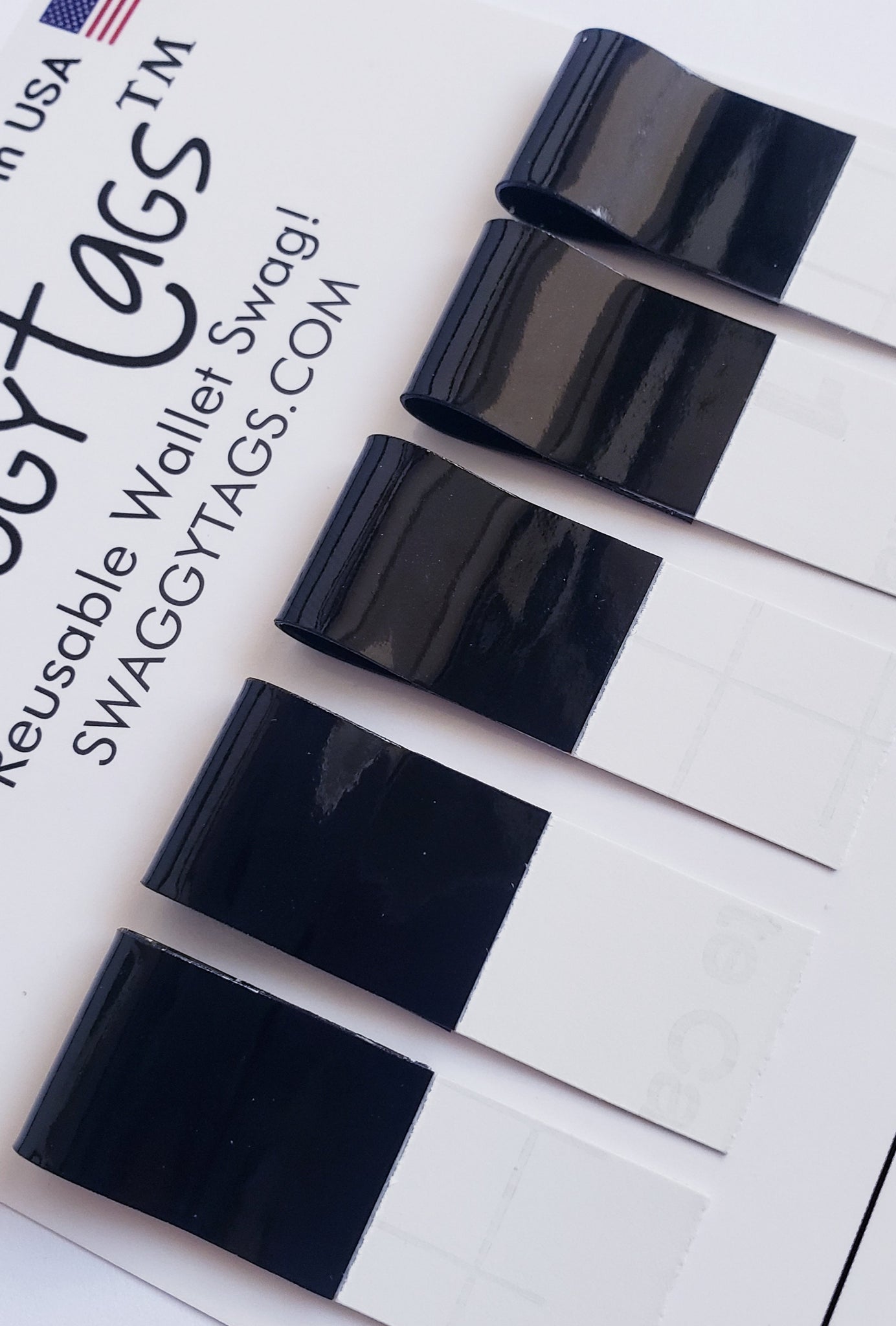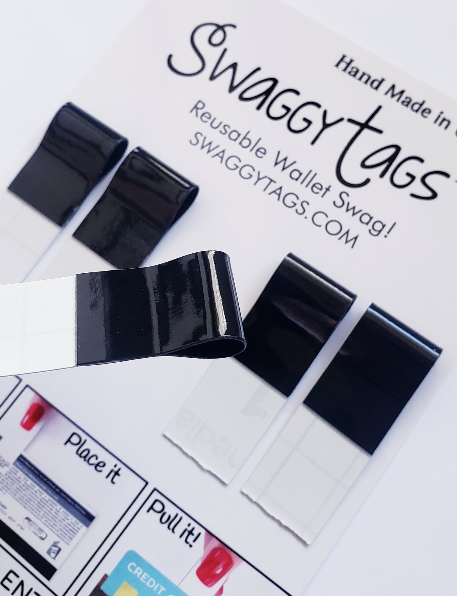 Swaggy Tags are Reusable Tags for pulling out credit cards, debit cards, ID, and store cards from your wallet with no hassles! Perfect for short nails, arthritis OR long nails! No more struggling at the gas pump and many ATMs. Even pick up dropped cards and coins on flat surfaces!