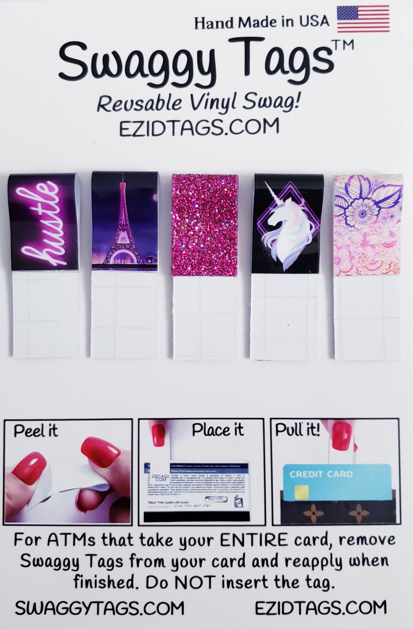 For ATMs that take your entire card, simply remove Swaggy Tags and reapply when finished. Do NOT insert the tag. Restick over and over!