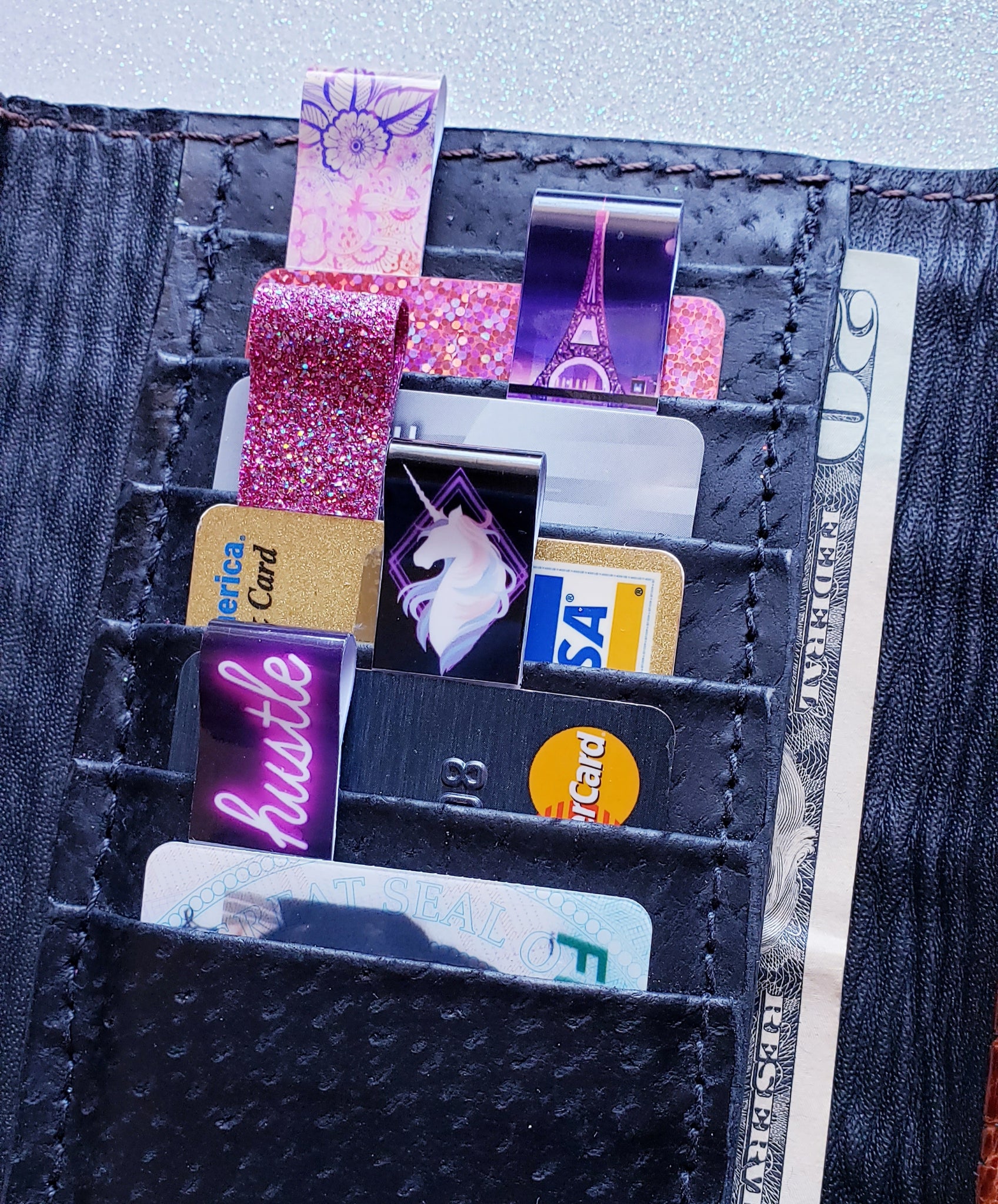 Swaggy Tags are Reusable Tags for pulling out credit cards, debit cards, ID, and store cards from your wallet with no hassles! Perfect for short nails, arthritis OR long nails! No more struggling at the gas pump and many ATMs. Even pick up dropped cards and coins on flat surfaces!
