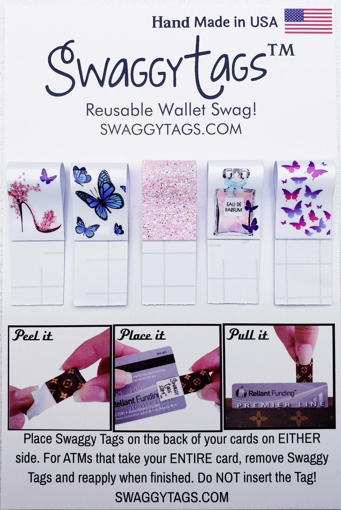 For ATMs that take your entire card, simply remove Swaggy Tags and reapply when finished. Do not insert the tag. Restick over and over!