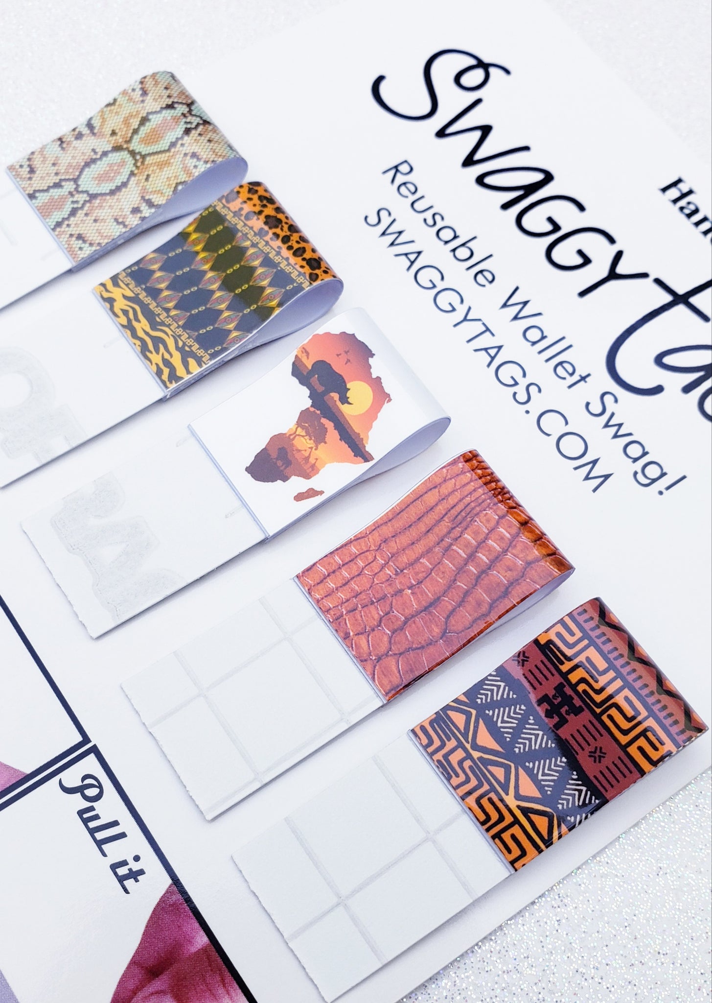 Swaggy Tags are Reusable Tags for pulling out credit cards, debit cards, ID, and store cards from your wallet with no hassles! Perfect for short nails, arthritis OR long nails! No more struggling at the gas pump and many ATMs. Even pick up dropped cards and coins on flat surfaces!