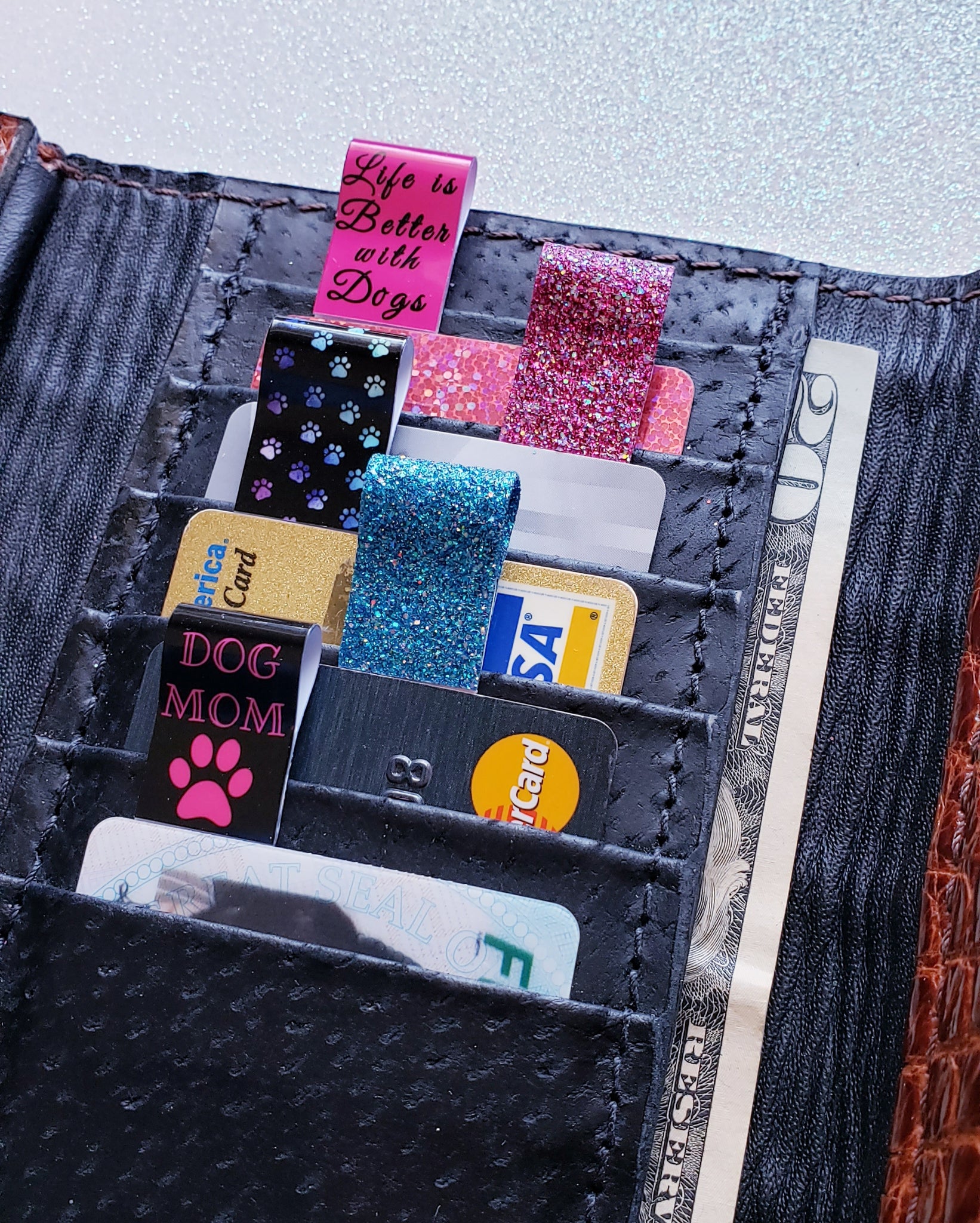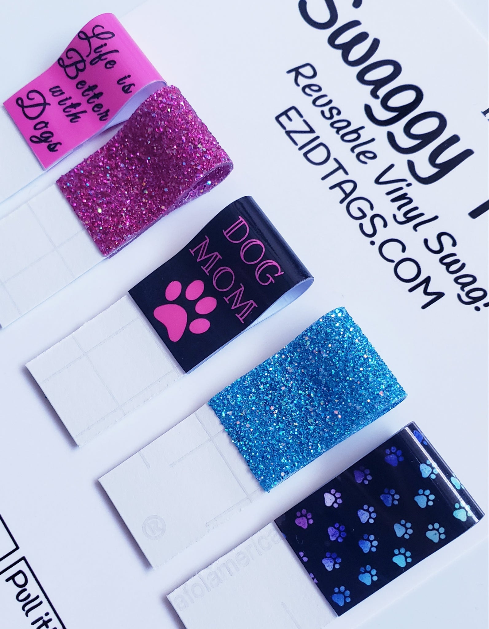 Swaggy Tags are Reusable Tags for pulling out credit cards, debit cards, ID, and store cards from your wallet with no hassles! Perfect for short nails, arthritis OR long nails! No more struggling at the gas pump and many ATMs. Even pick up dropped cards and coins on flat surfaces!