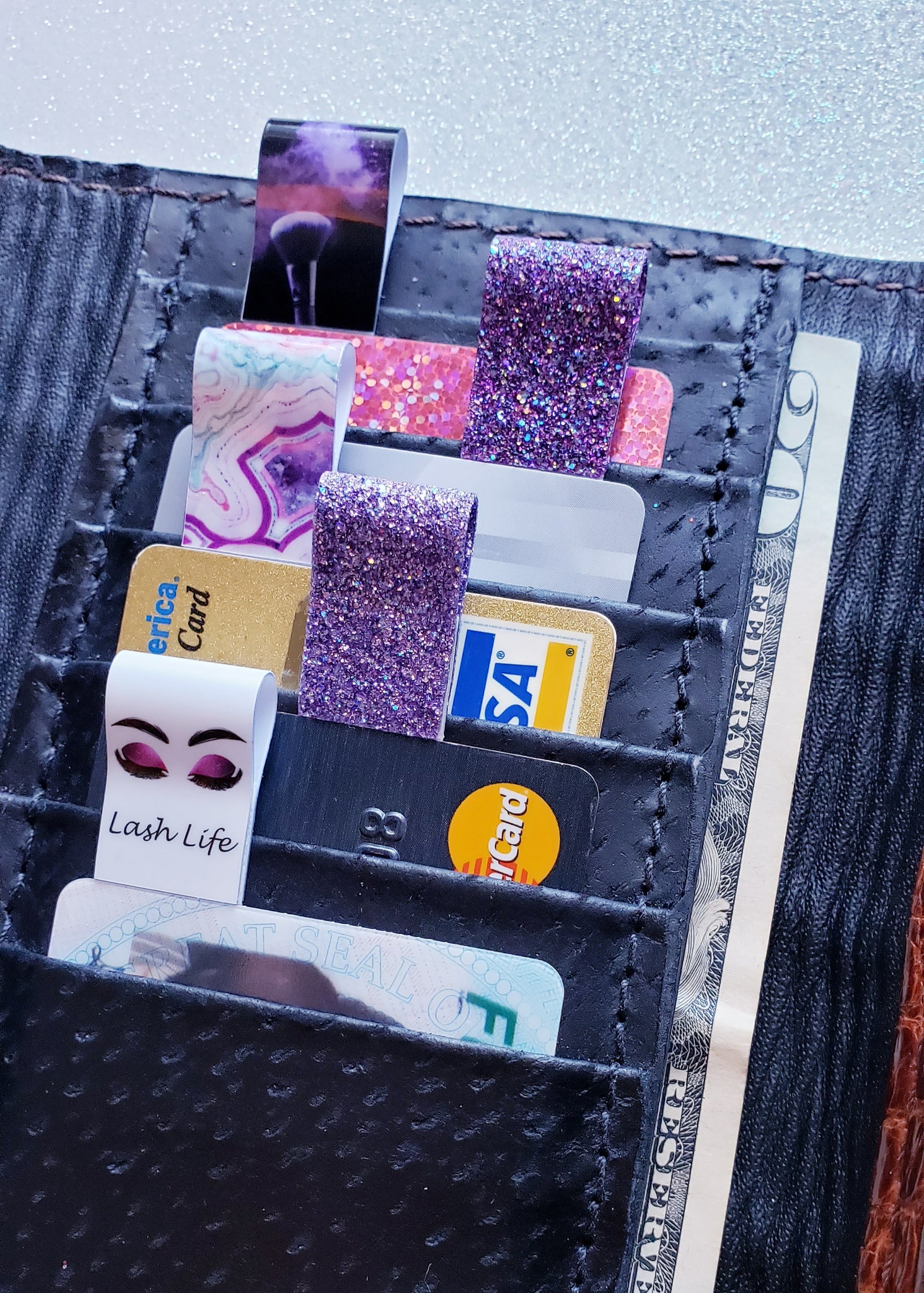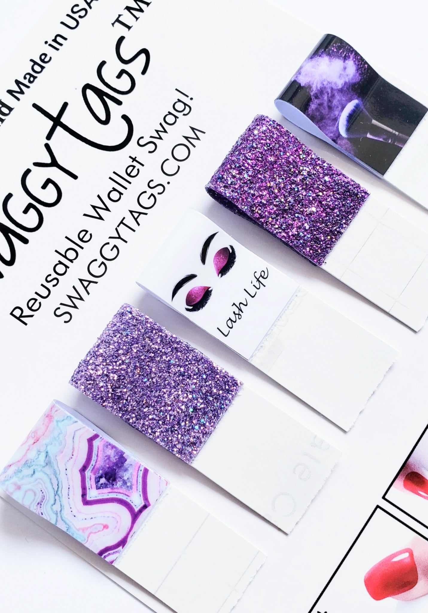 Swaggy Tags are Reusable Tags for pulling out credit cards, debit cards, ID, and store cards from your wallet with no hassles! Perfect for short nails, arthritis OR long nails! No more struggling at the gas pump and many ATMs. Even pick up dropped cards and coins on flat surfaces!