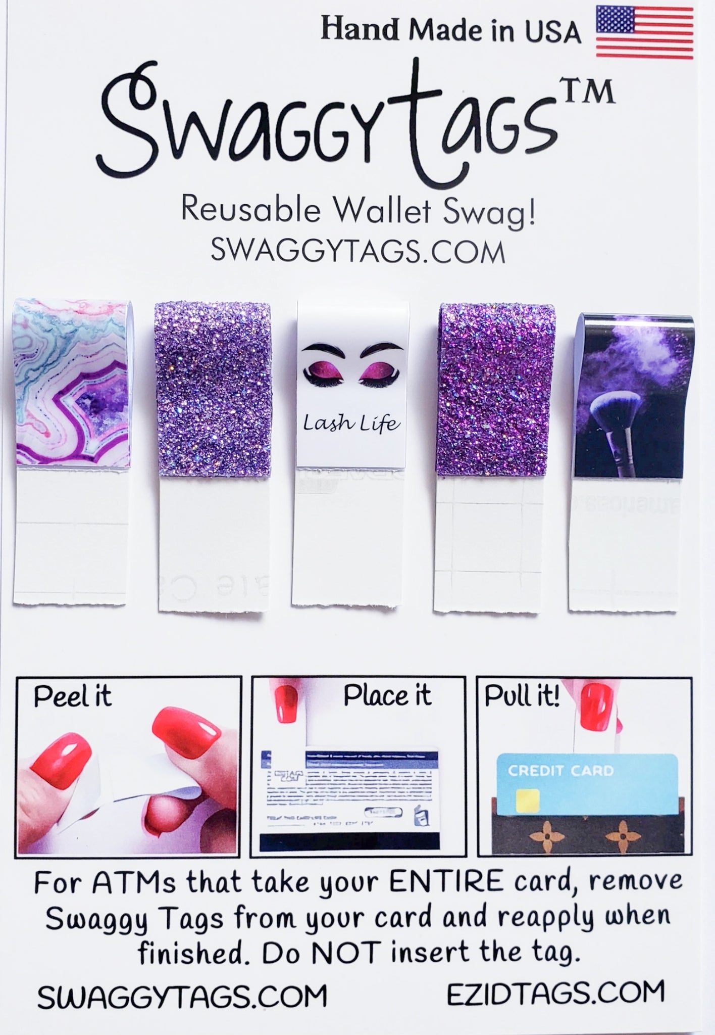 💜For ATMs that take your entire card, simply remove Swaggy Tags and reapply when finished. Restick over and over.